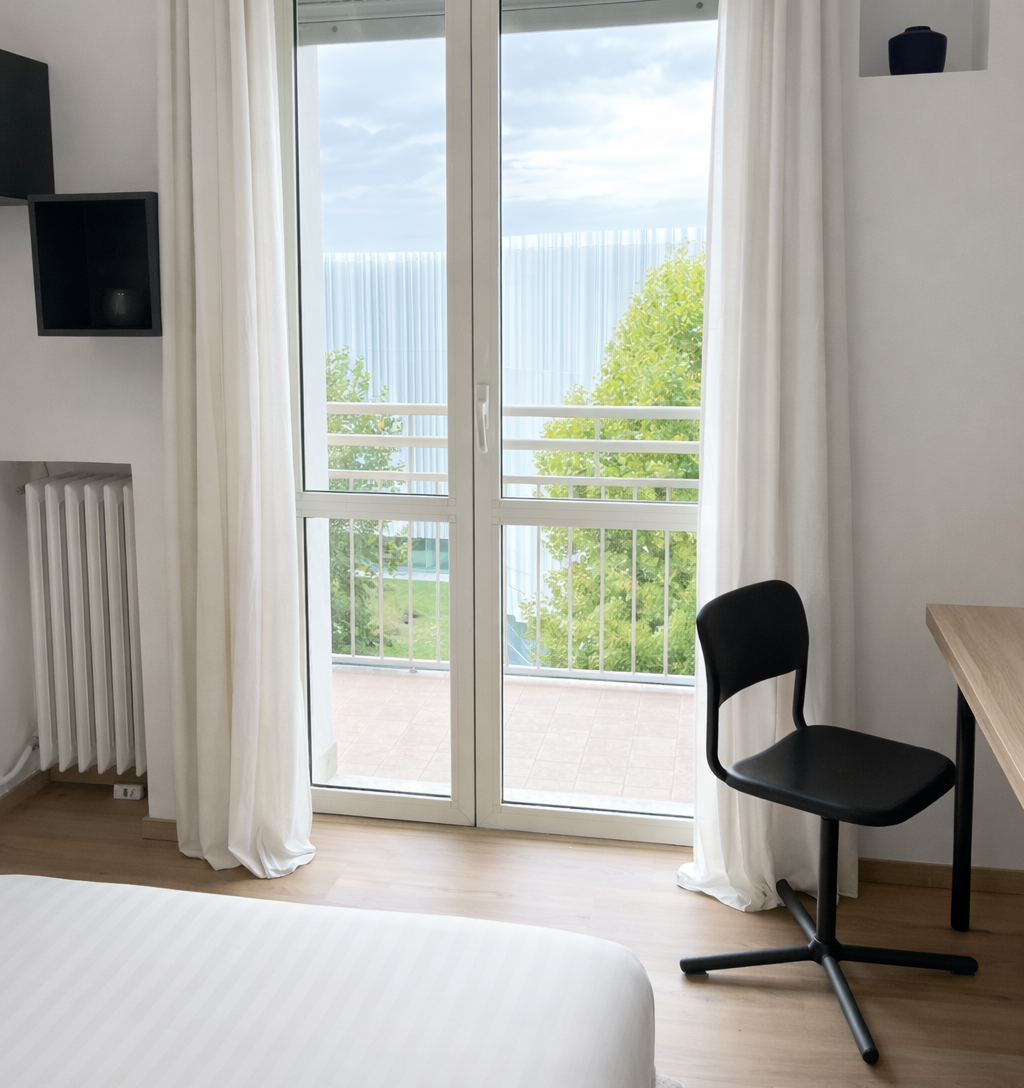 A spacious and elegantly appointed double room featuring warm wood flooring, a wall-mounted Smart TV, dedicated workspace with desk and chair, air conditioning, two high-gloss fitted wardrobes, decorative wall shelving, and Edison-style bedside lamps. The room is decorated with curated botanical-inspired wall art and benefits from excellent natural light through floor-to-ceiling doors opening onto a private balcony with a stunning view of the campus. Guests have access to a shared bathroom finished in neutral stone-effect tiles, featuring a rain shower, large mirror with vanity lighting, and heated towel rail. All guests also enjoy access to a shared kitchen and dining area.